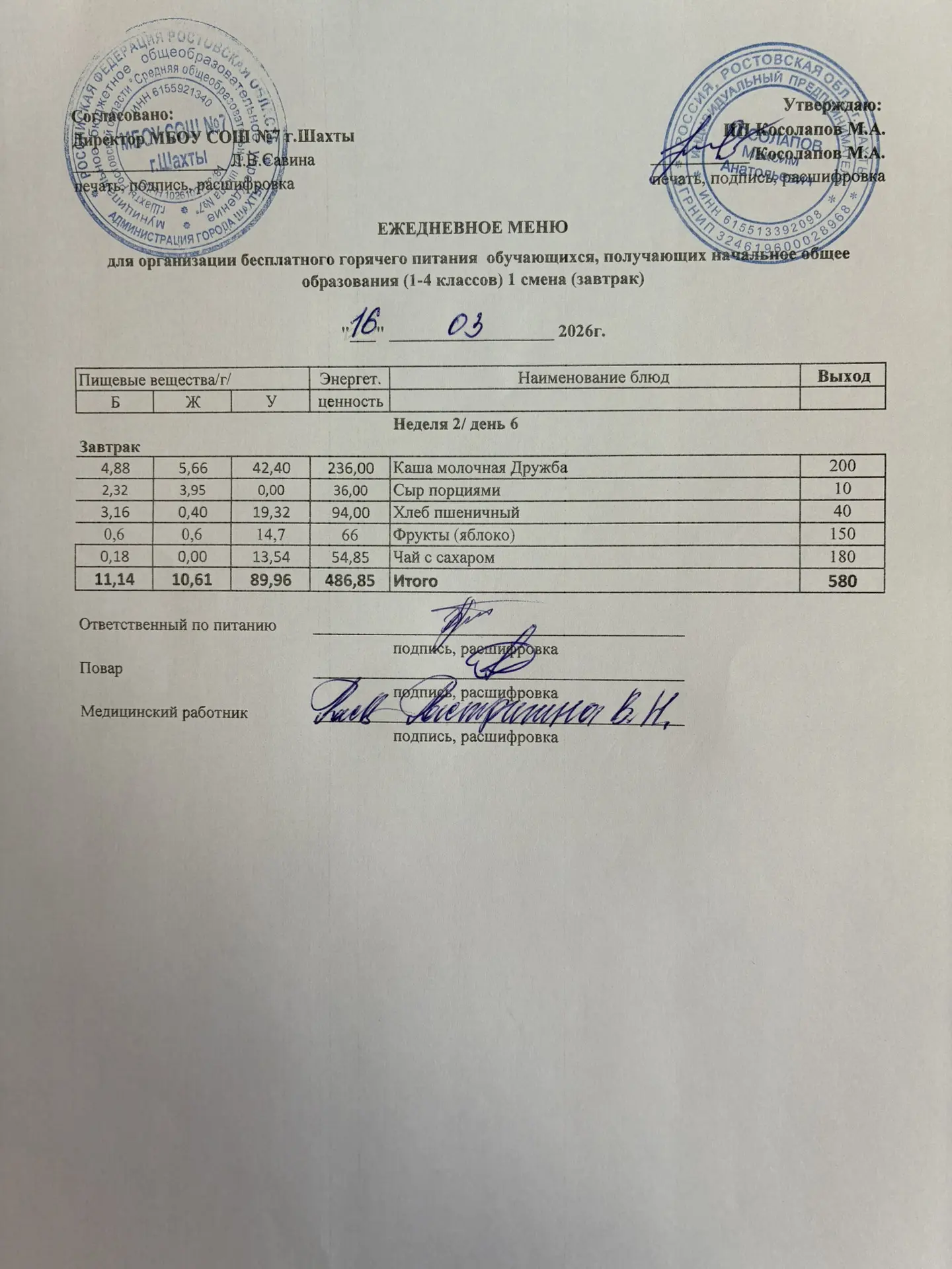 Меню 16.03. 2026 год для обучающихся льготных категорий 1-4 классов (завтрак)