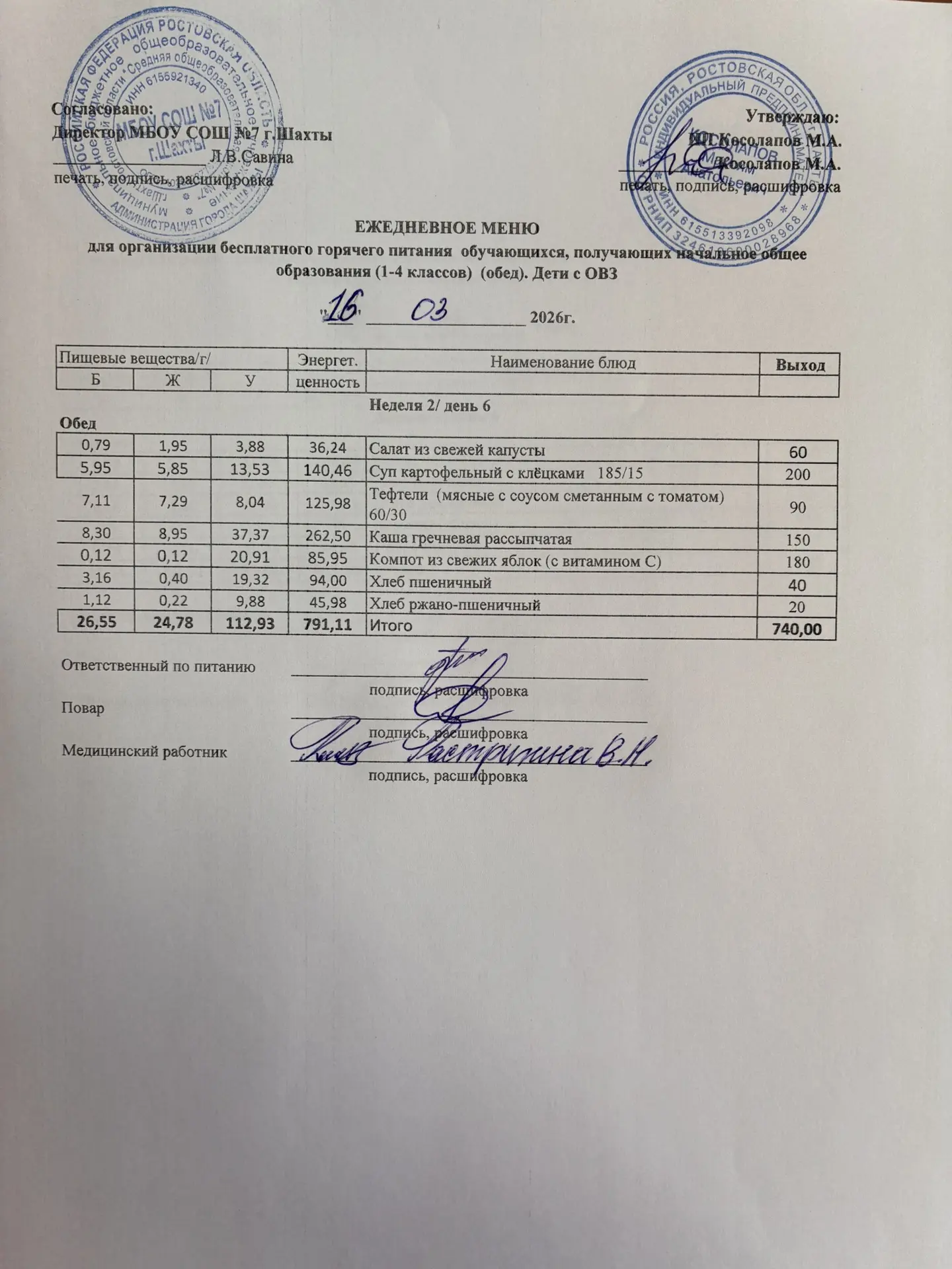 Меню 16.03. 2026 год для обучающихся льготных категорий 1-4 классов (ОВЗ)