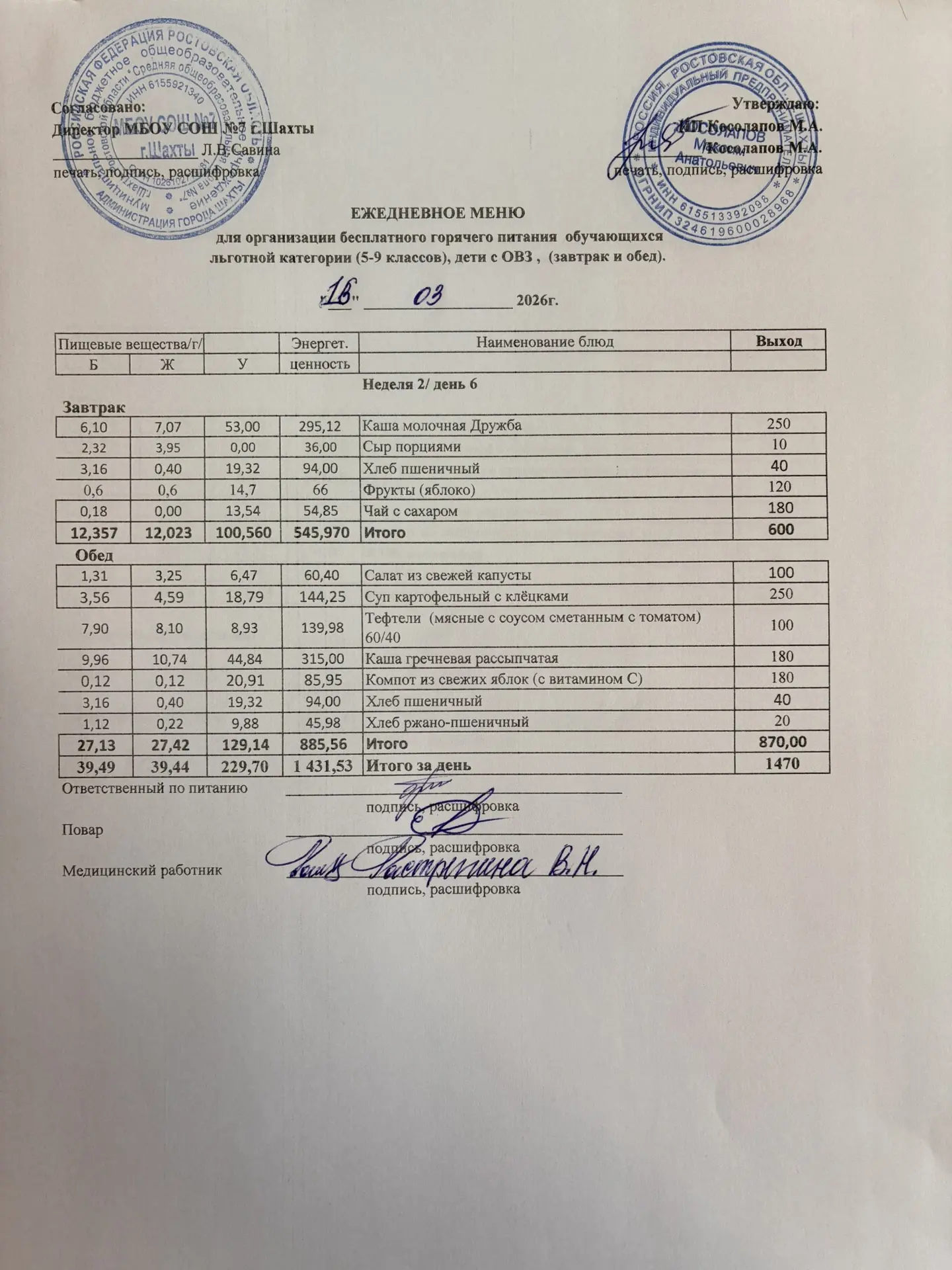 Меню 16.03. 2026 год для обучающихся льготных категорий 5-9 классов, дети с ОВЗ (завтраки и обед)