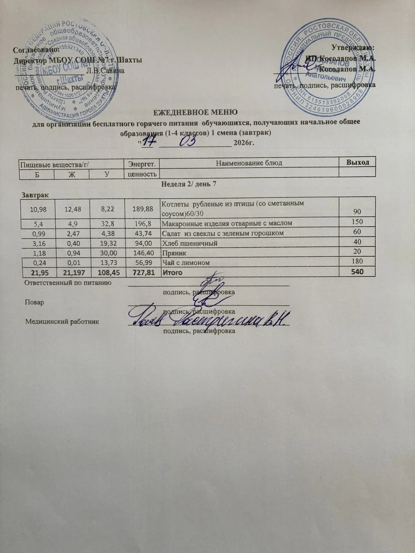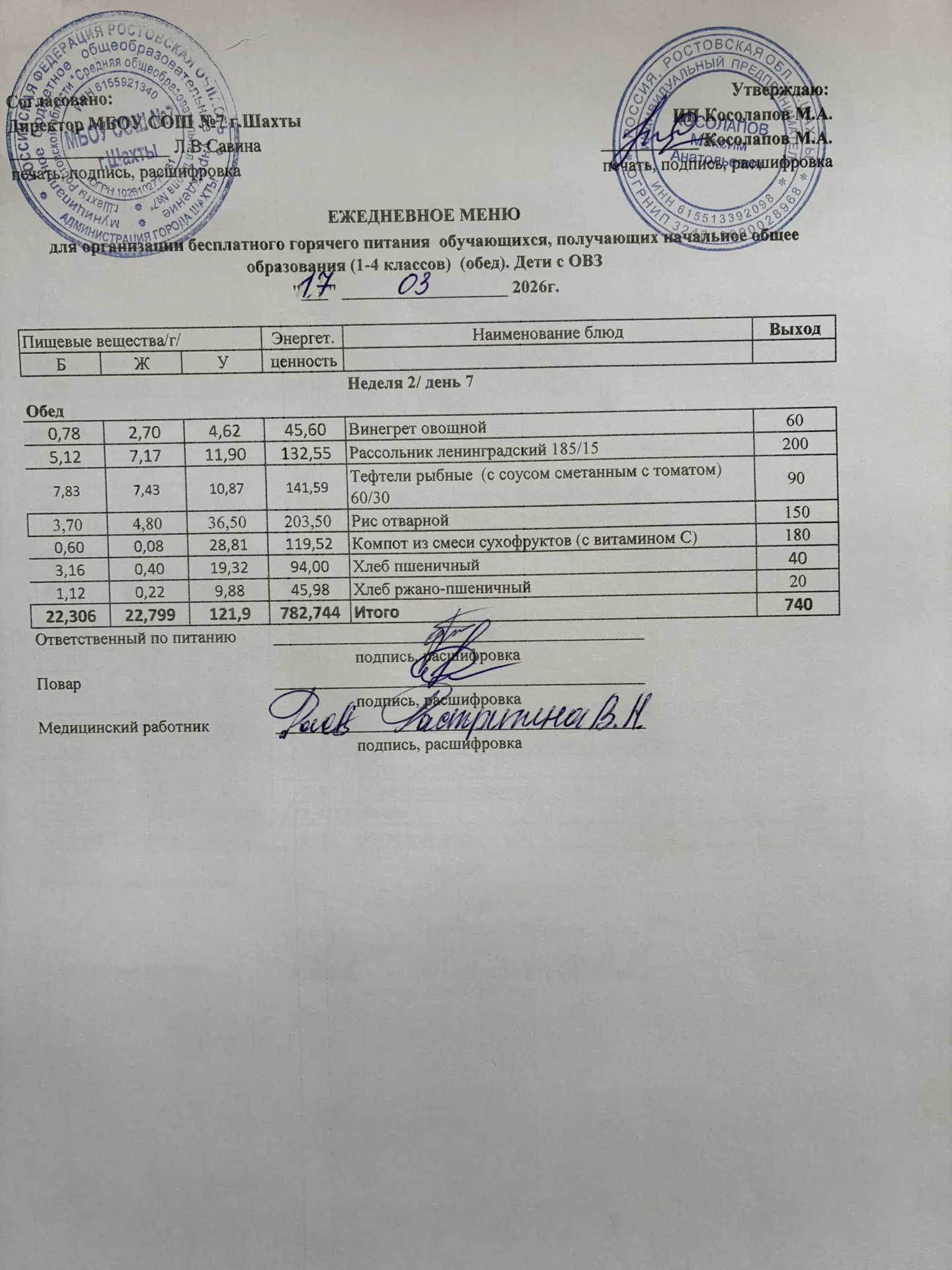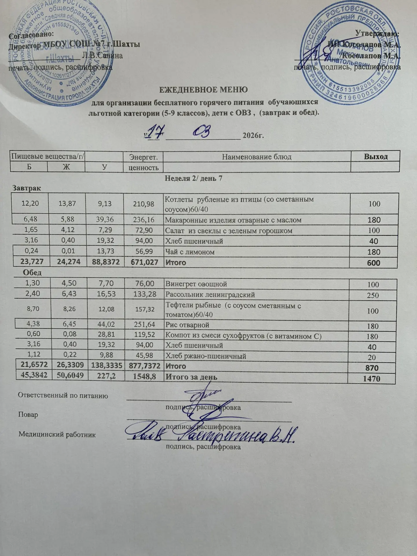Меню 17.03. 2026 год для обучающихся льготных категорий 5-9 классов, дети с ОВЗ (завтраки и обед)