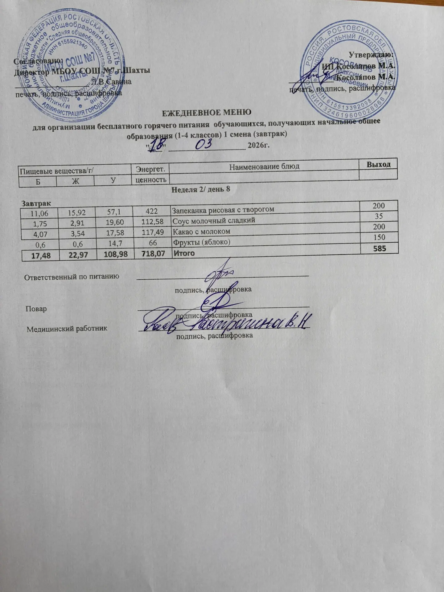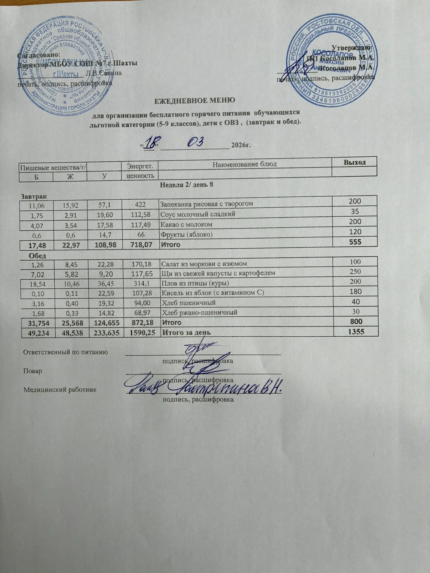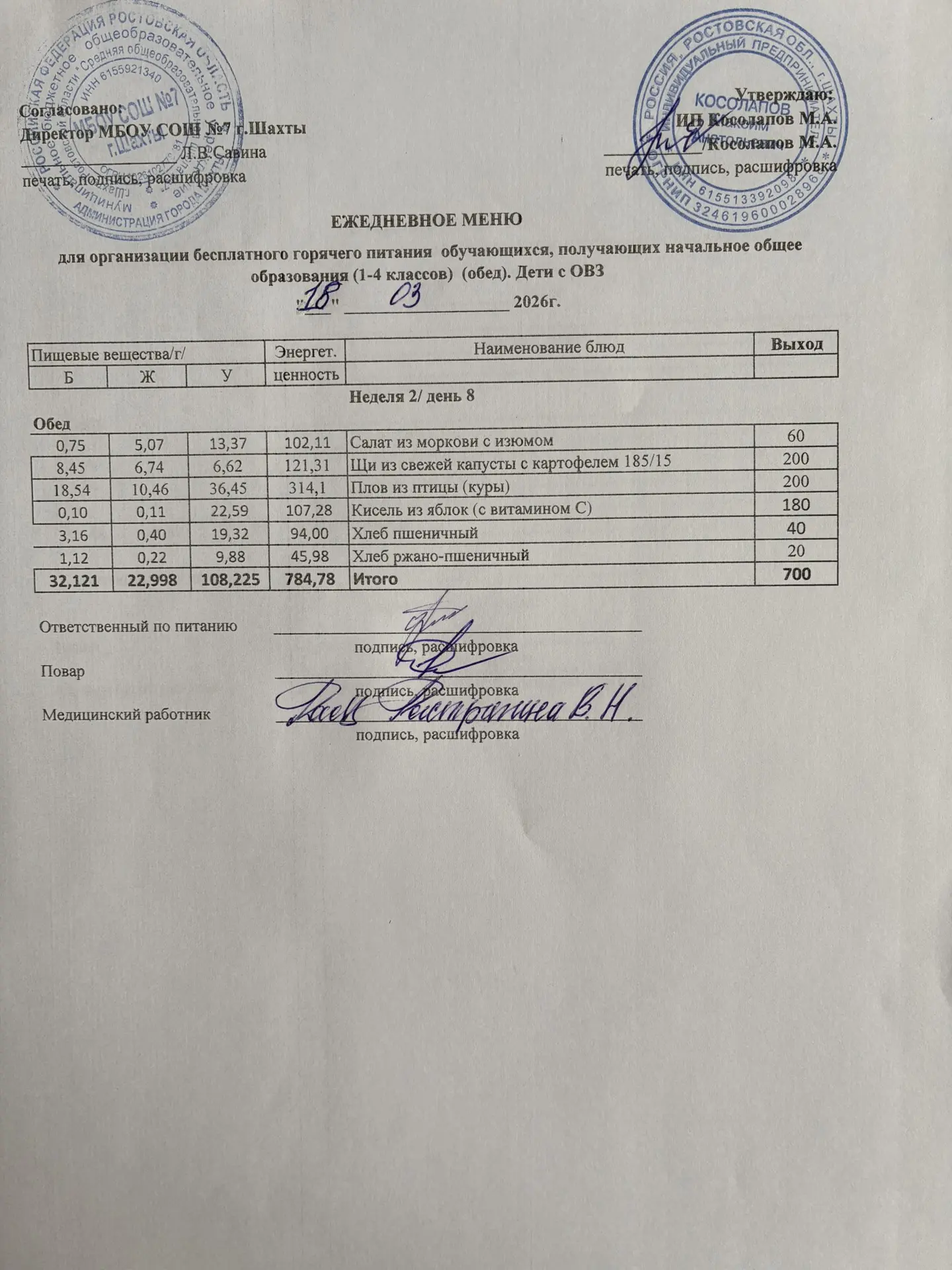 Меню 18.03. 2026 год для обучающихся льготных категорий 5-9 классов, дети с ОВЗ (завтраки и обед)