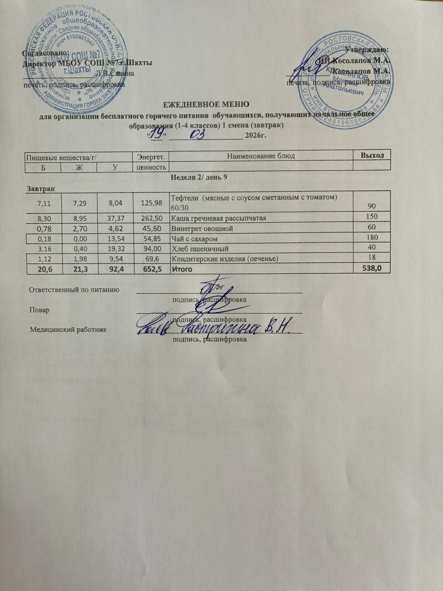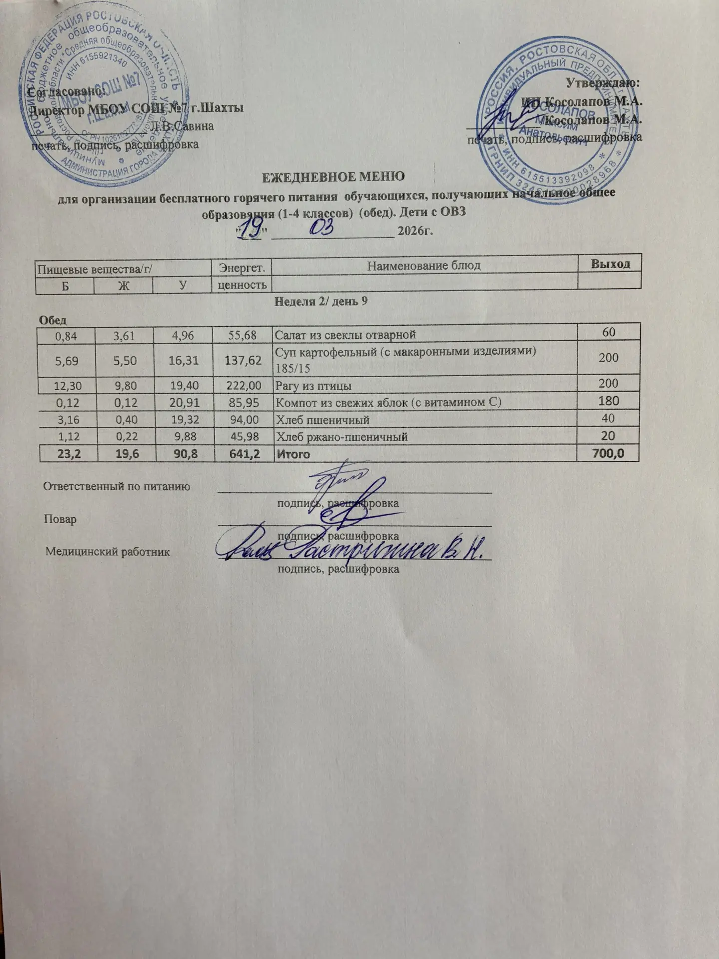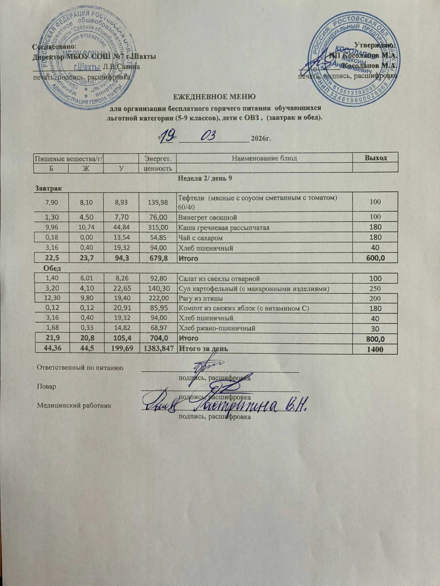 Меню 19.03. 2026 год для обучающихся льготных категорий 5-9 классов, дети с ОВЗ (завтраки и обед)