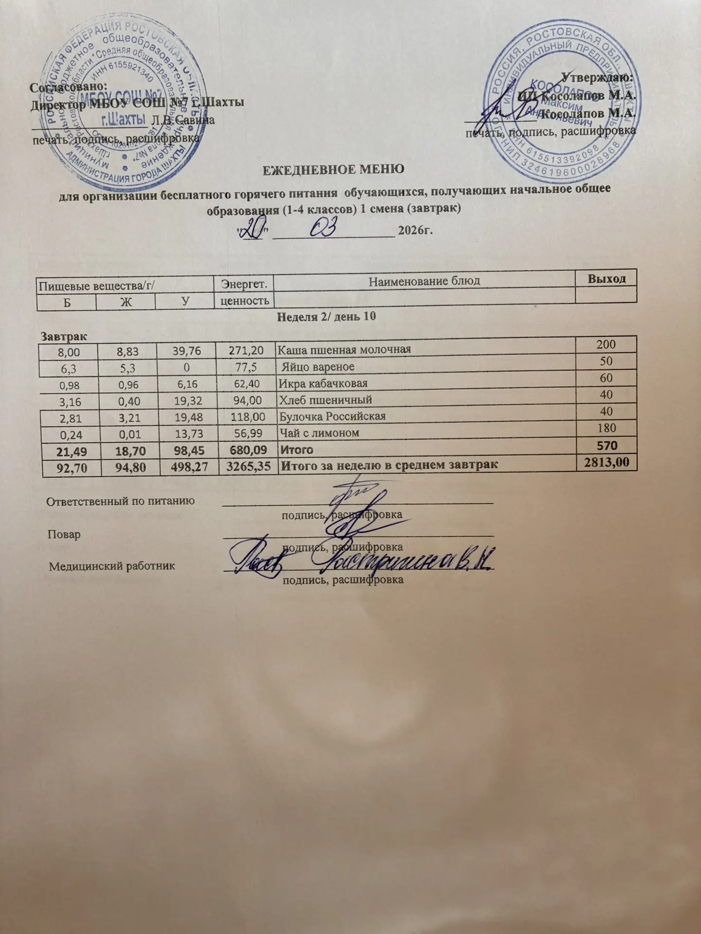 Меню 20.03. 2026 год для обучающихся льготных категорий 5-9 классов, дети с ОВЗ (завтраки и обед)