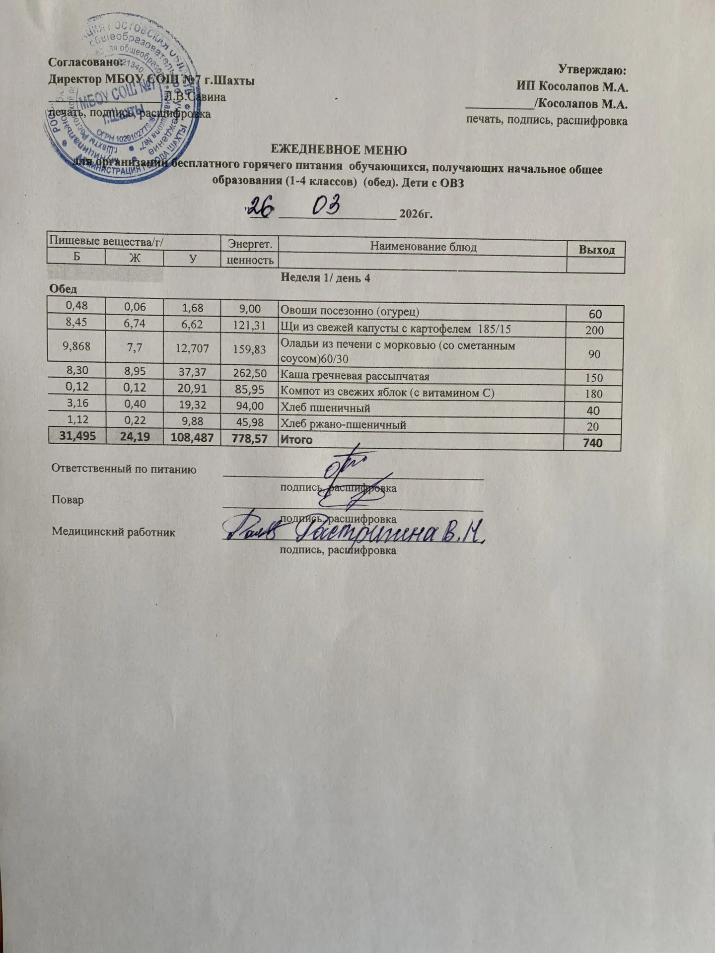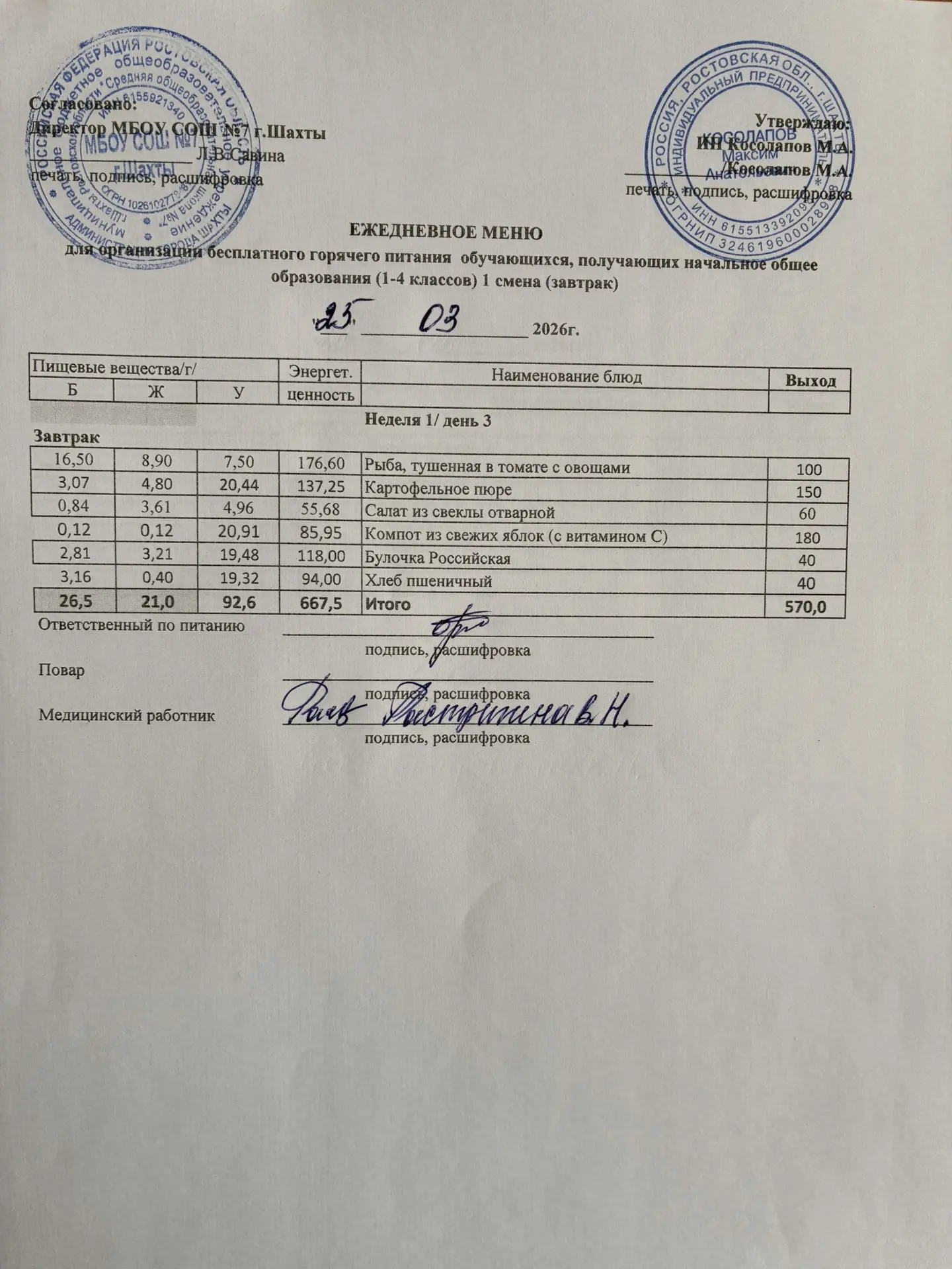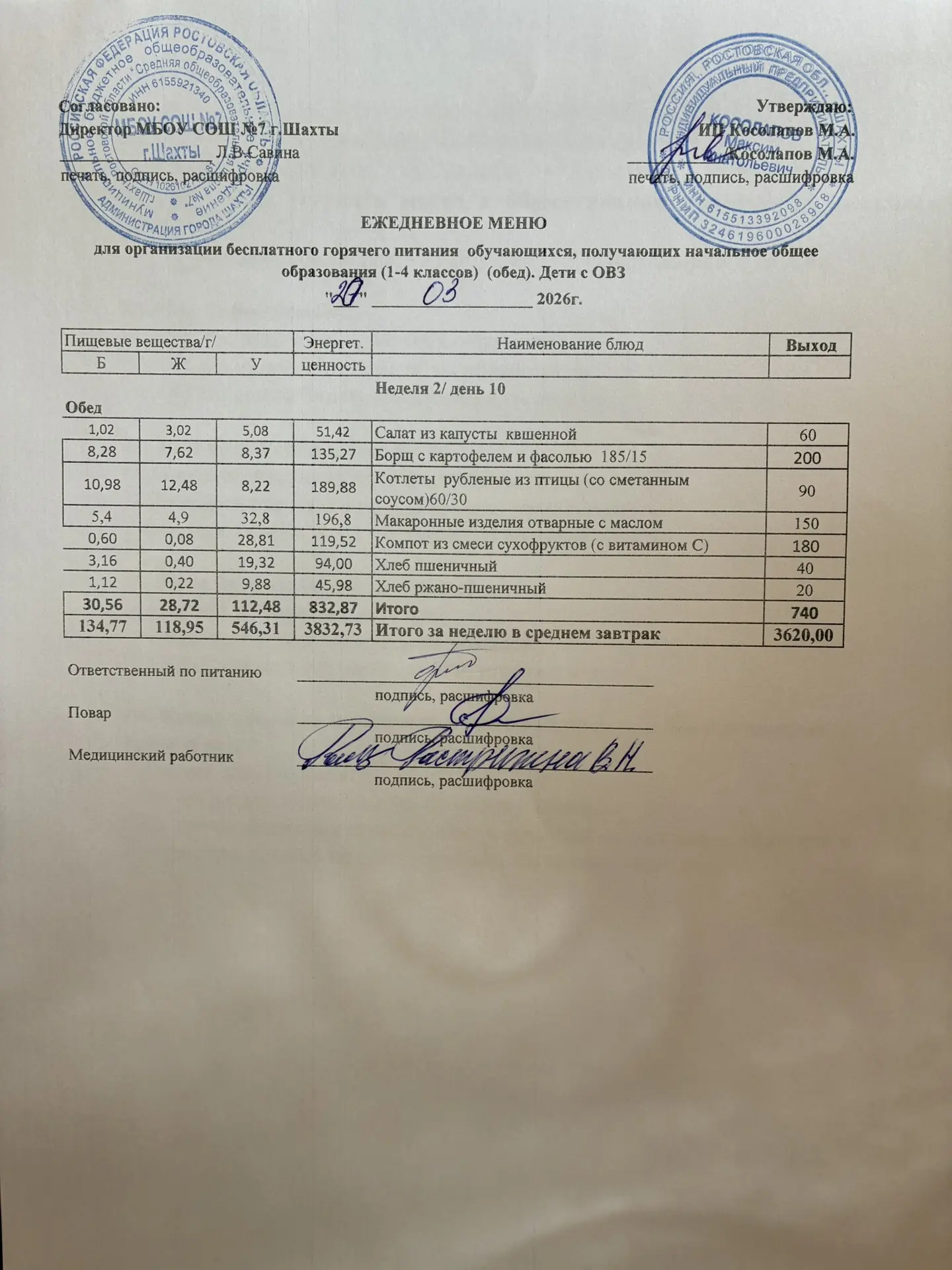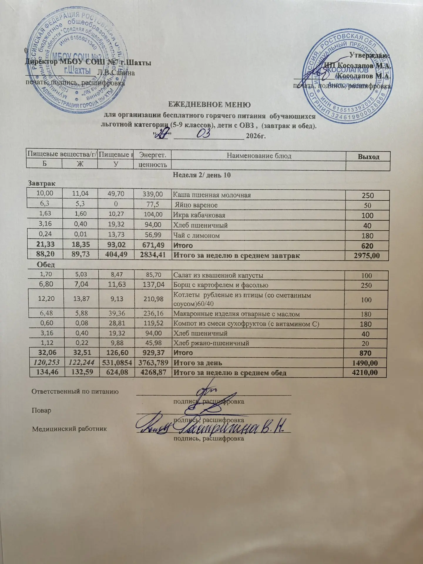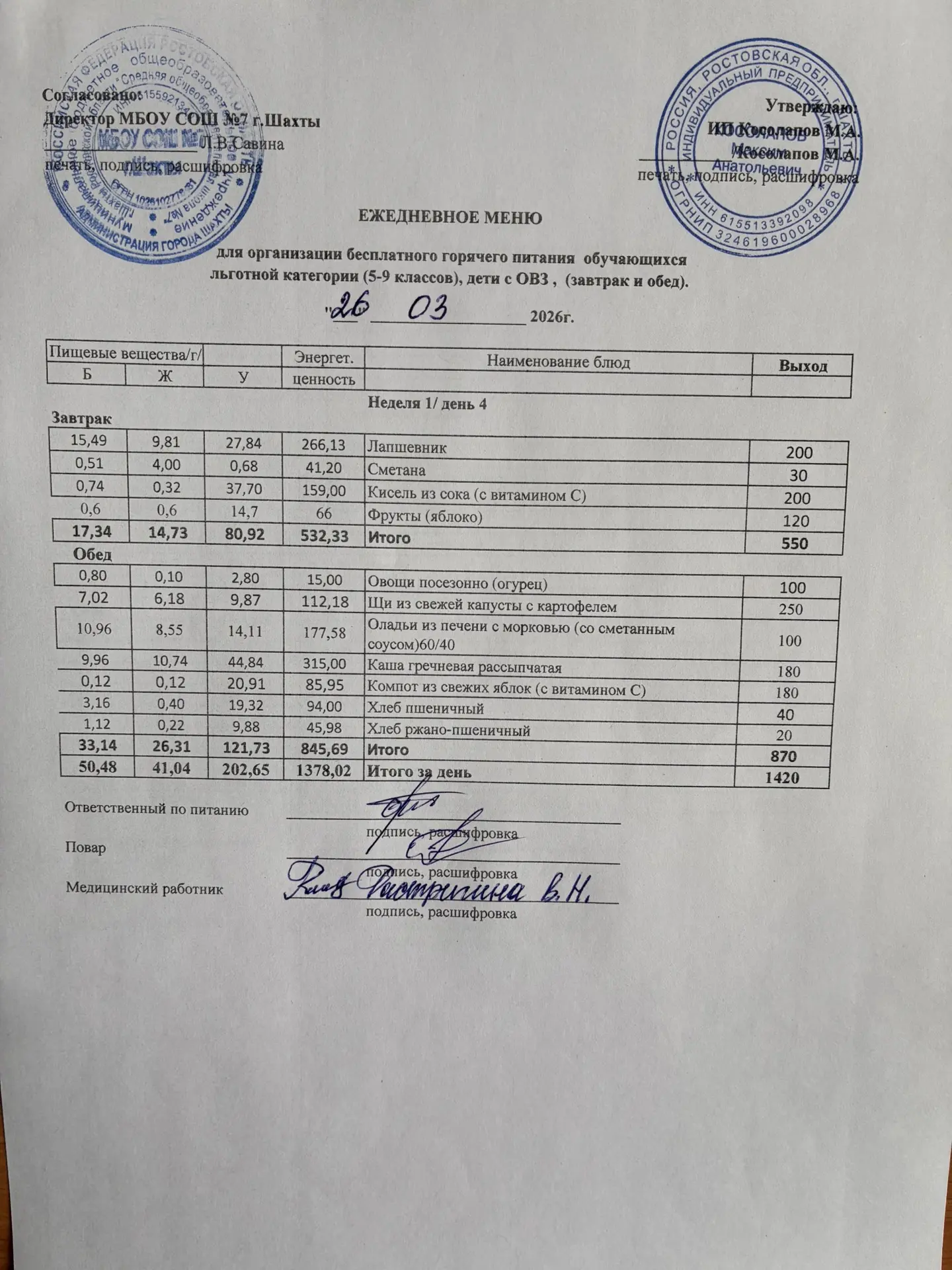 Меню 26.03. 2026 год для обучающихся льготных категорий 5-9 классов, дети с ОВЗ (завтраки и обед)