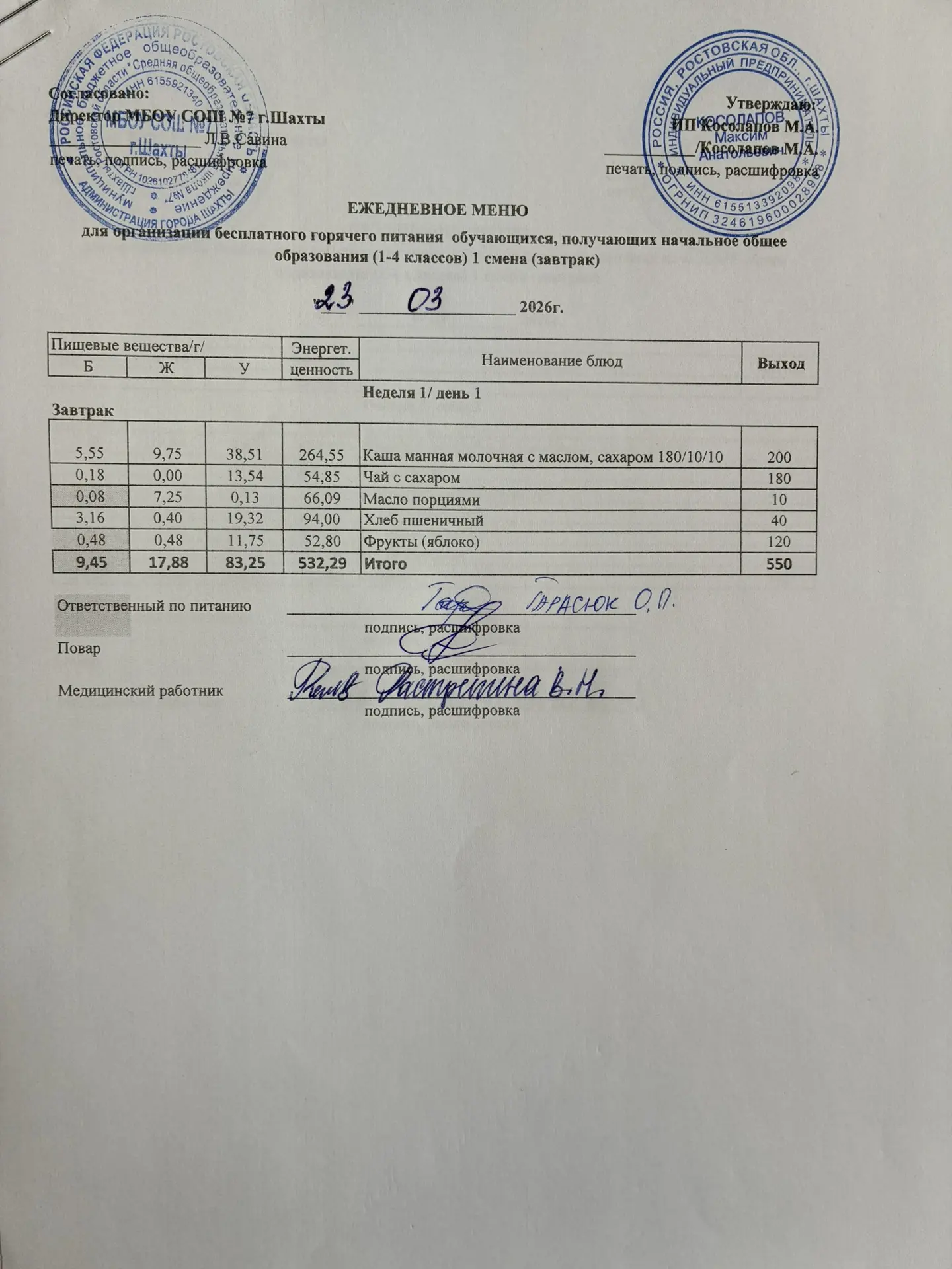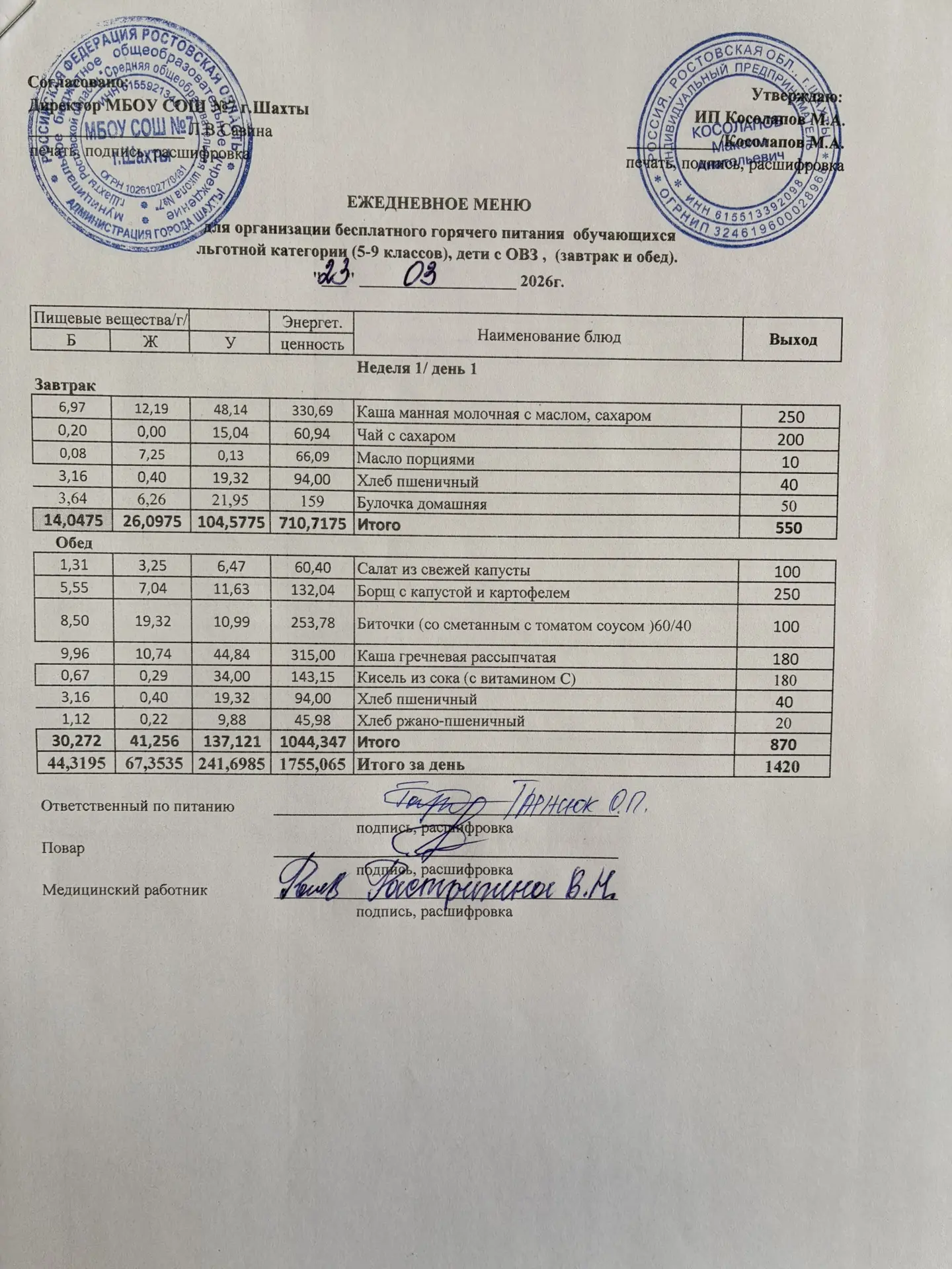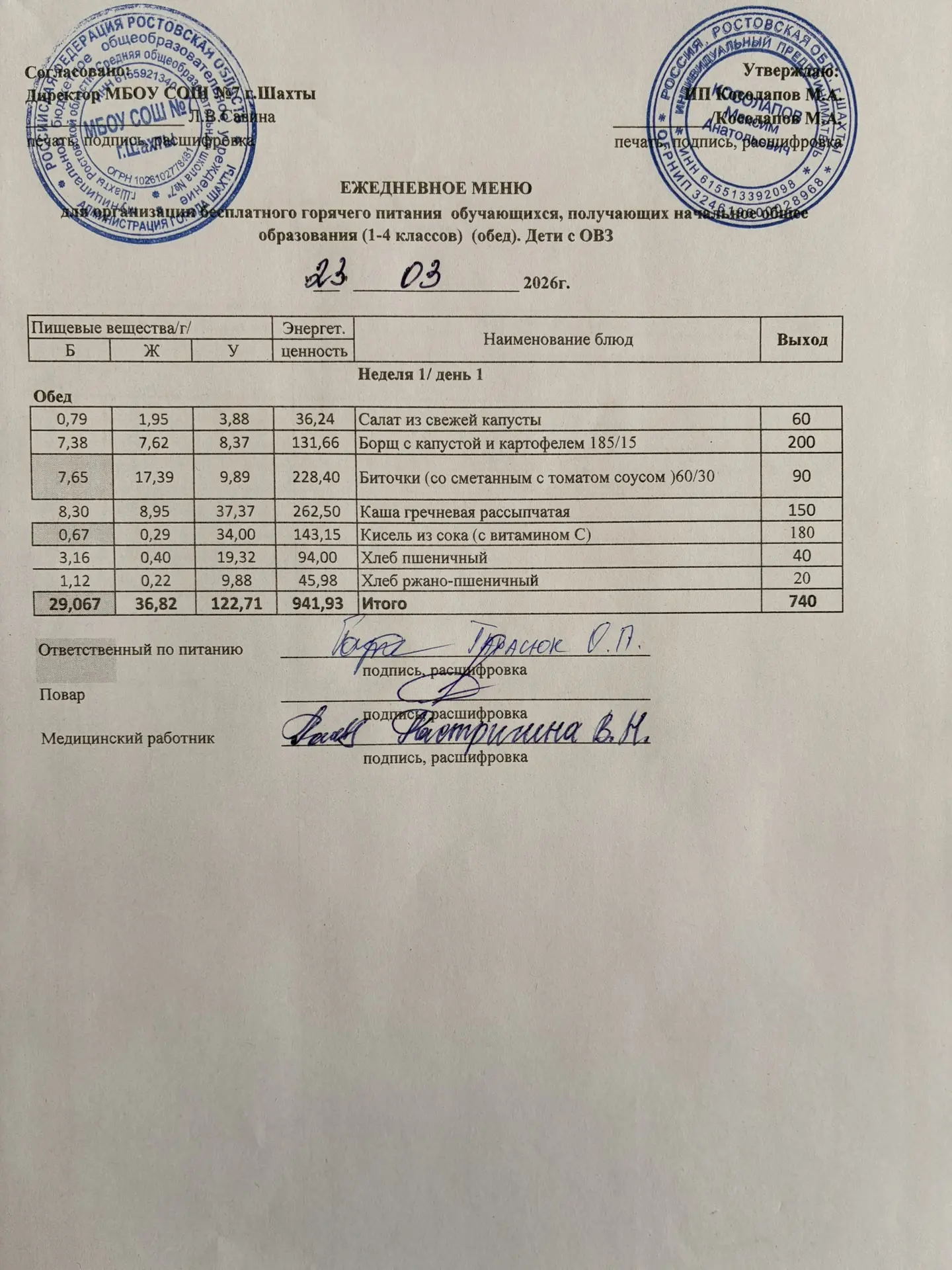 Меню 23.03. 2026 год для обучающихся льготных категорий 5-9 классов, дети с ОВЗ (завтраки и обед)