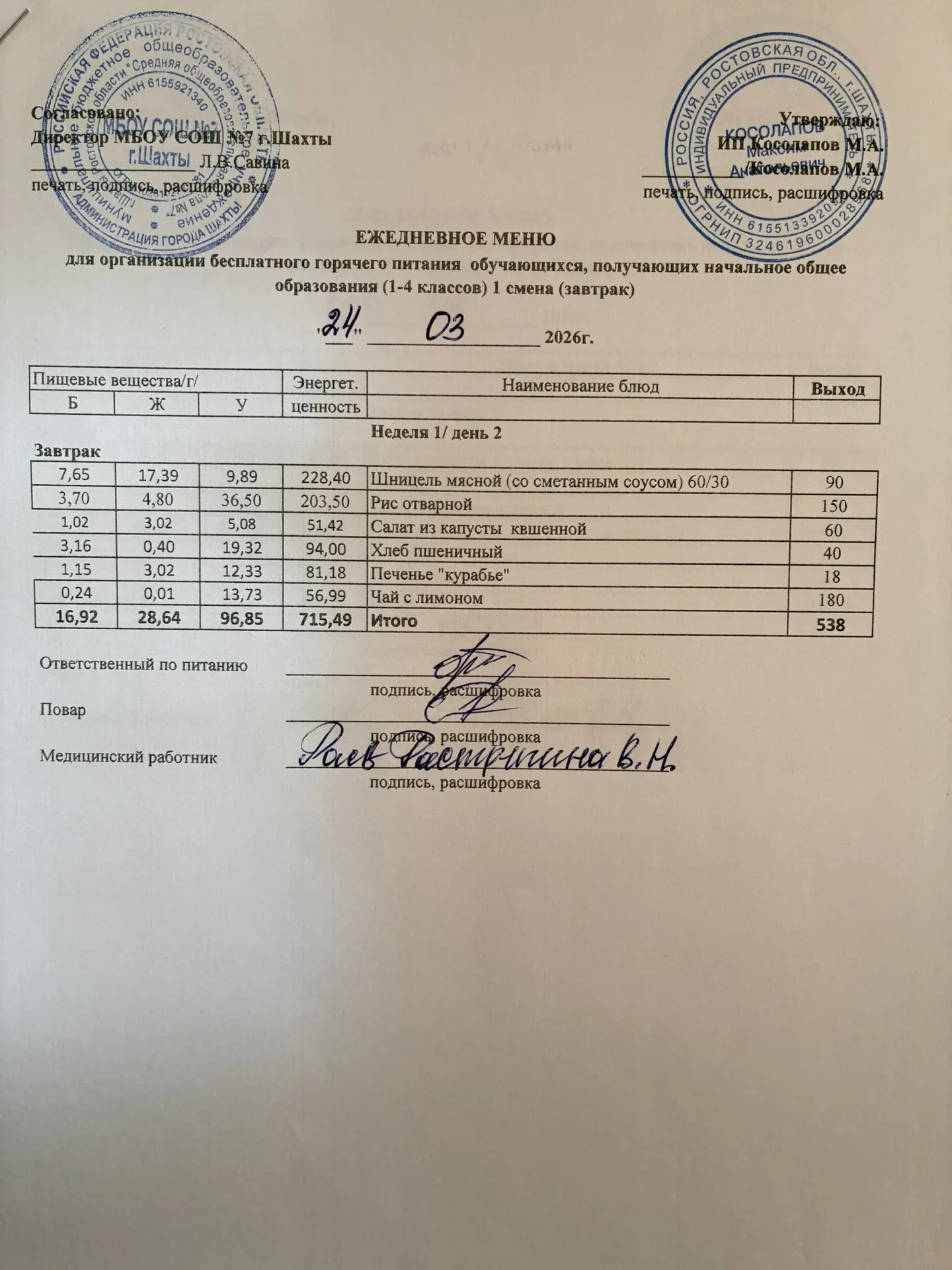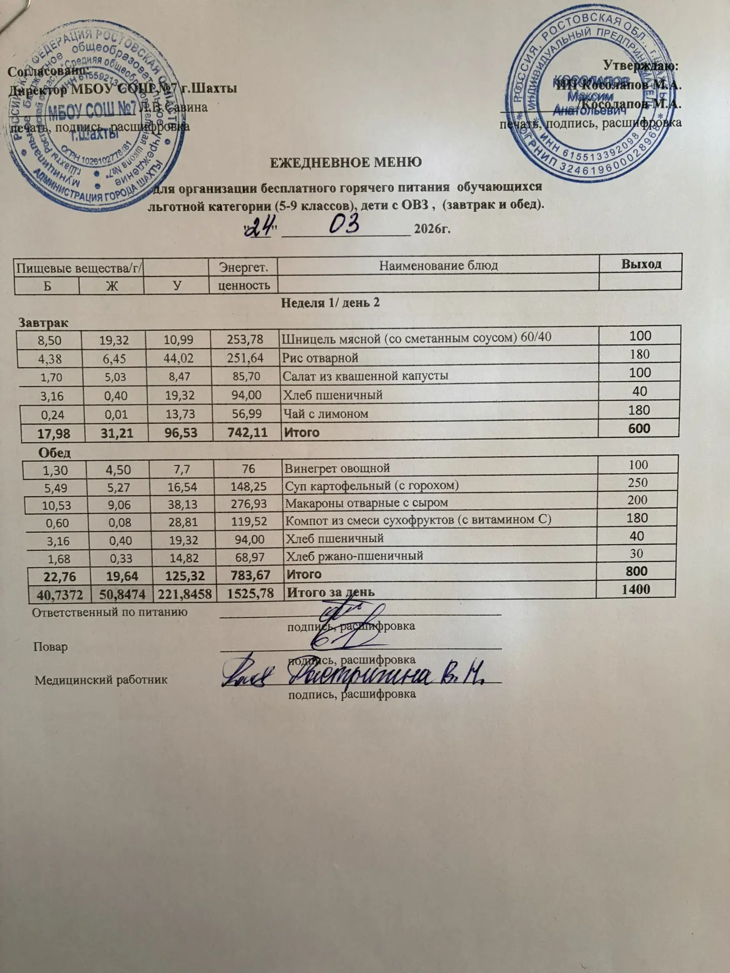 Меню 24.03. 2026 год для обучающихся льготных категорий 5-9 классов, дети с ОВЗ (завтраки и обед)