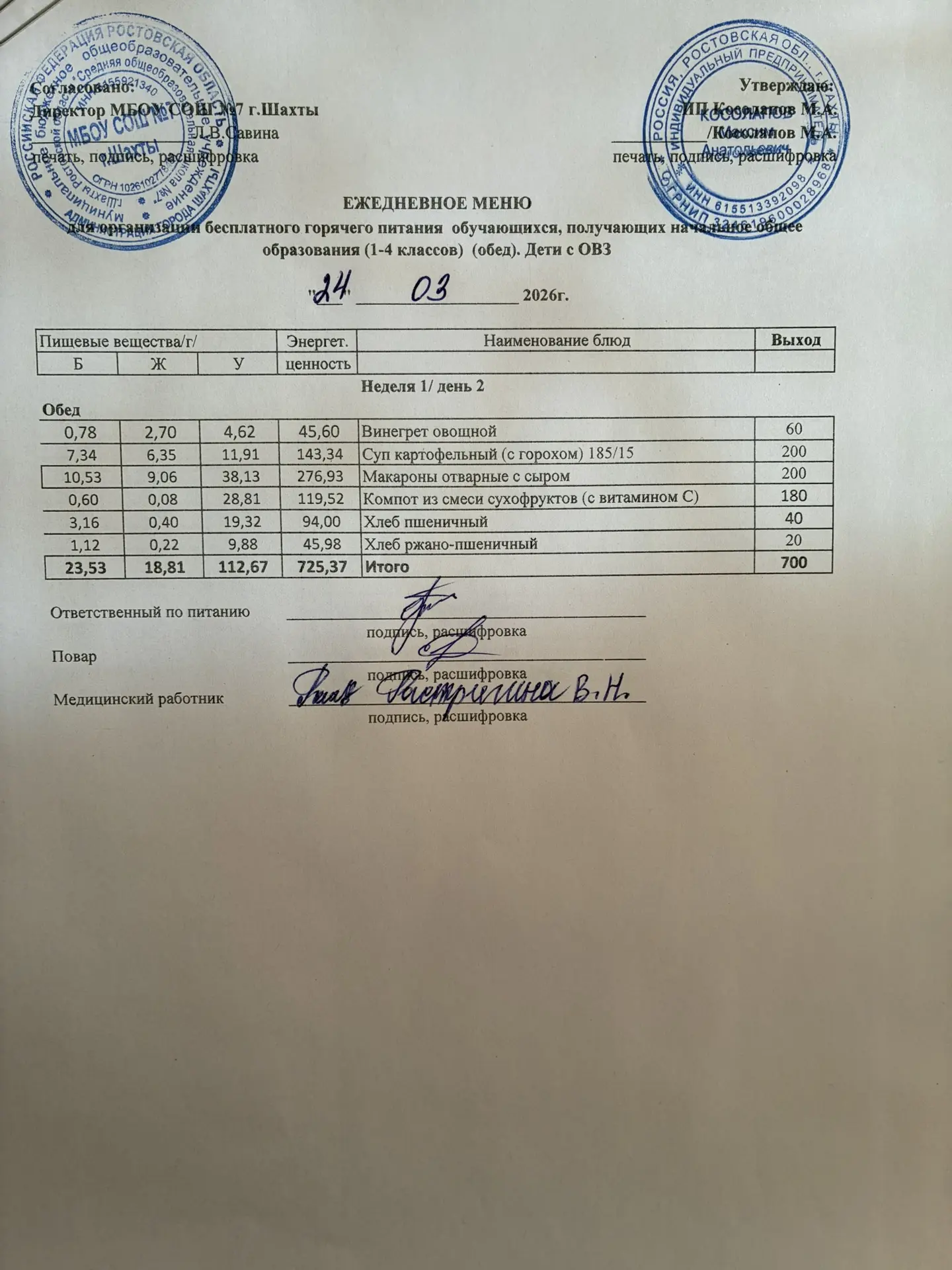 Меню 24.03. 2026 год для обучающихся льготных категорий 1-4 классов (ОВЗ)