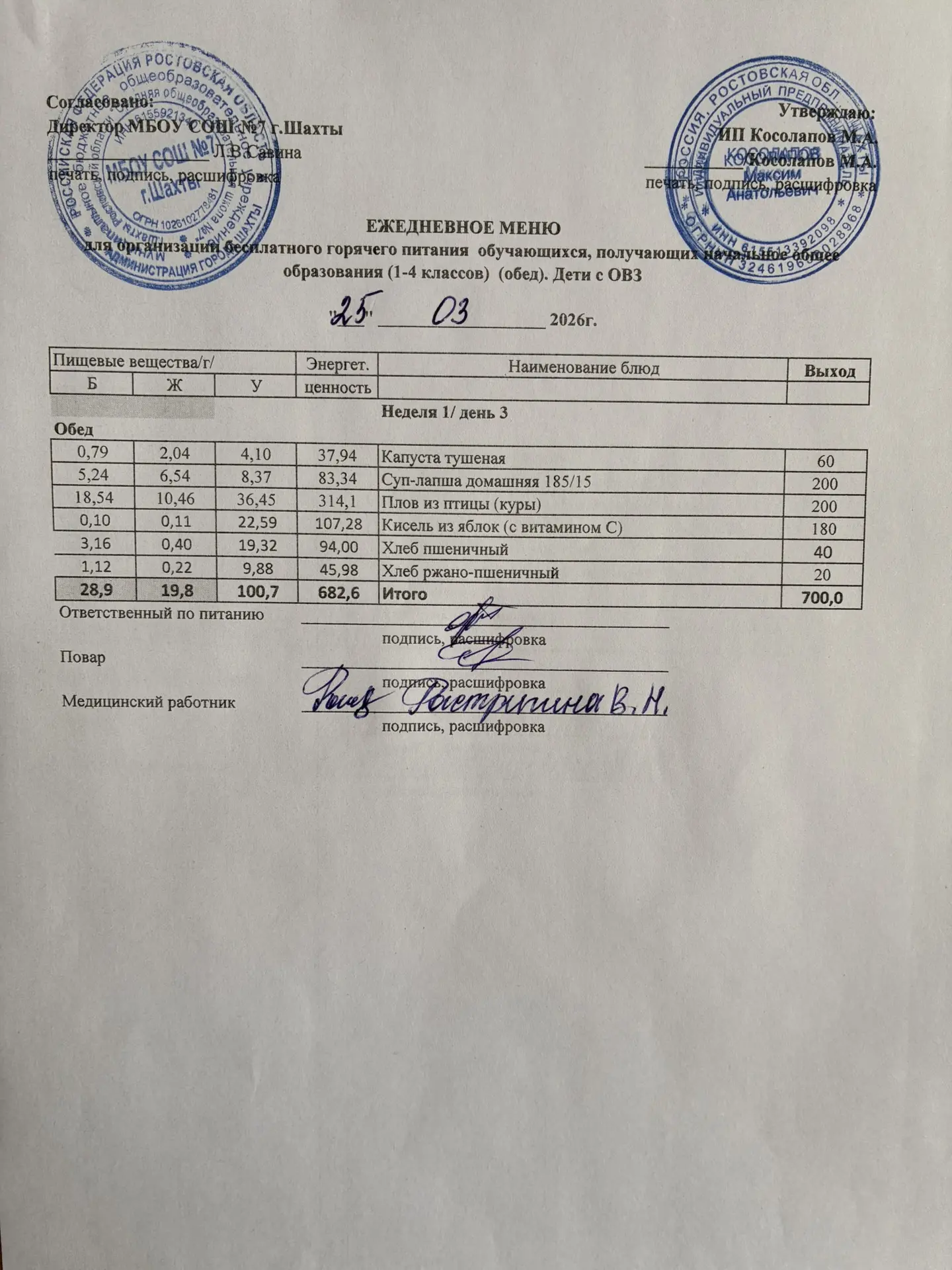 Меню 25.03. 2026 год для обучающихся льготных категорий 1-4 классов (ОВЗ)