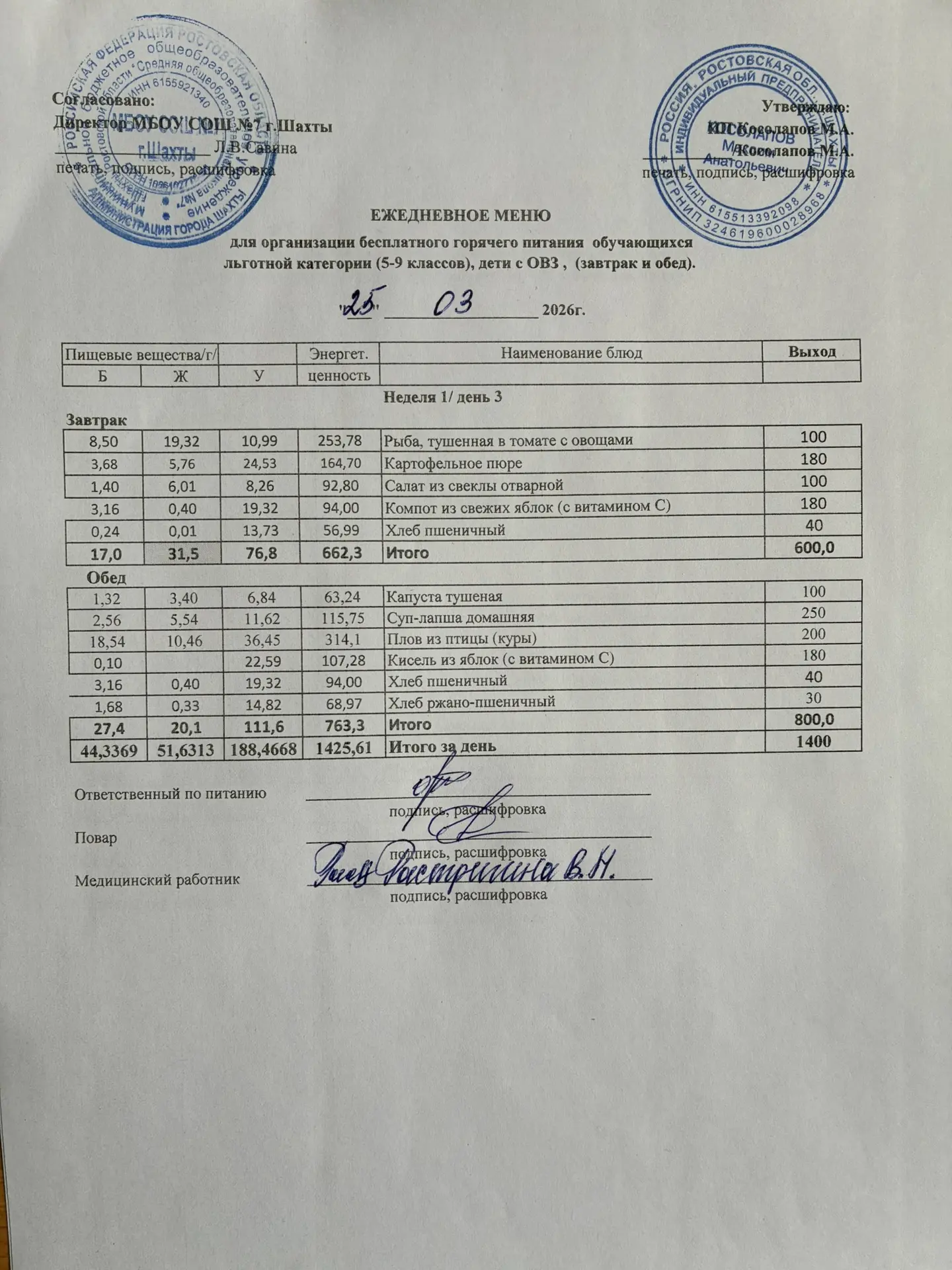 Меню 25.03. 2026 год для обучающихся льготных категорий 5-9 классов, дети с ОВЗ (завтраки и обед)