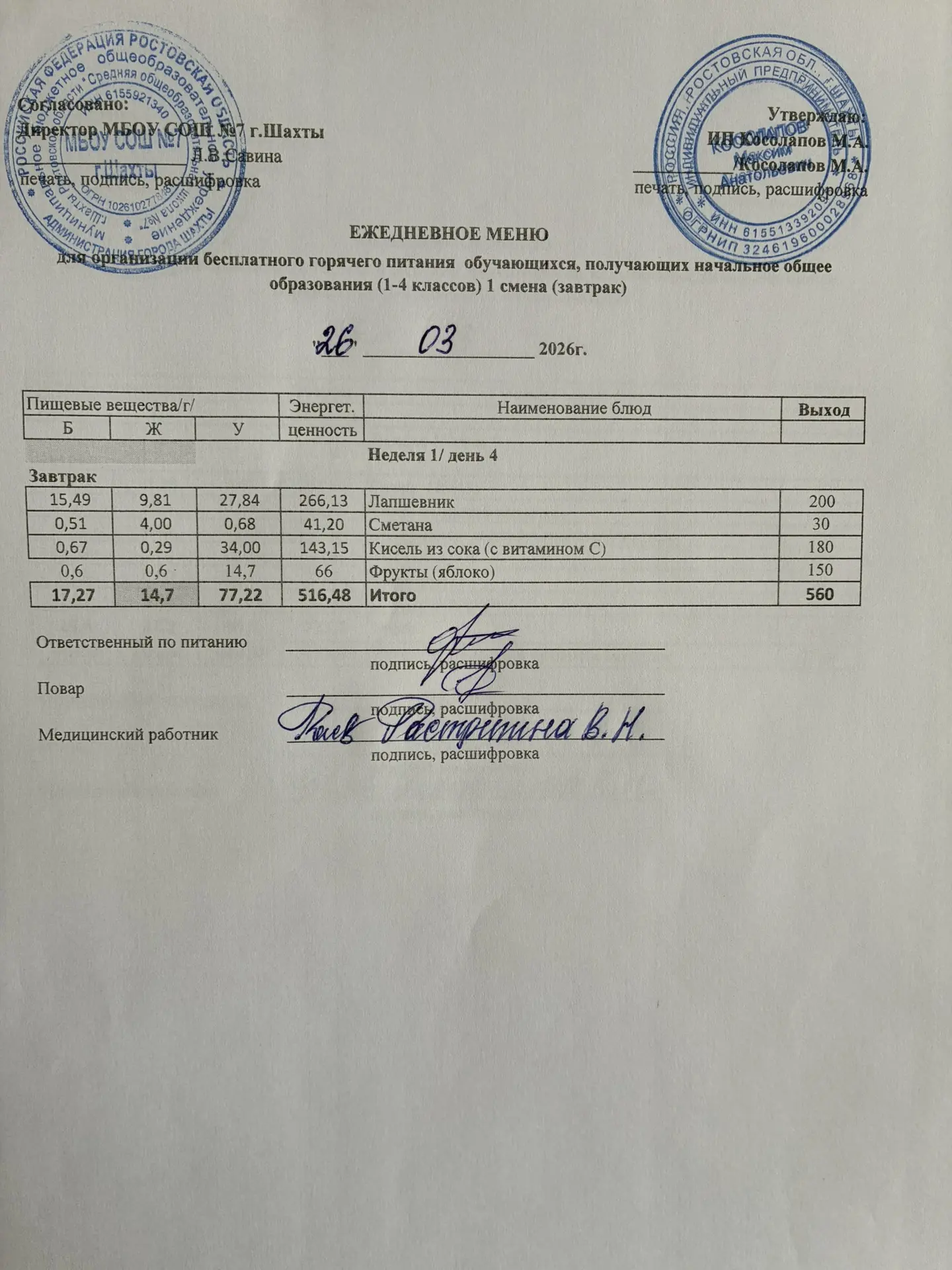 Меню 26.03. 2026 год для обучающихся льготных категорий 1-4 классов (ОВЗ)