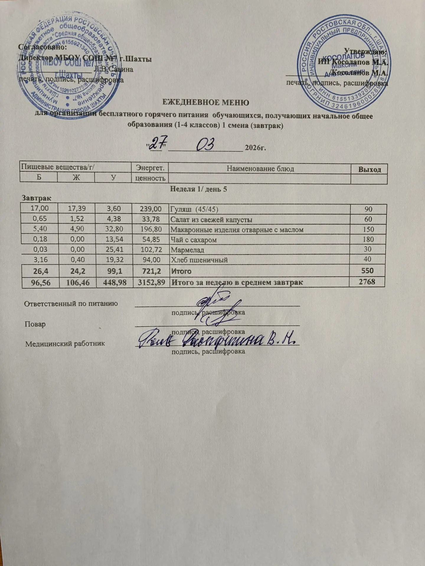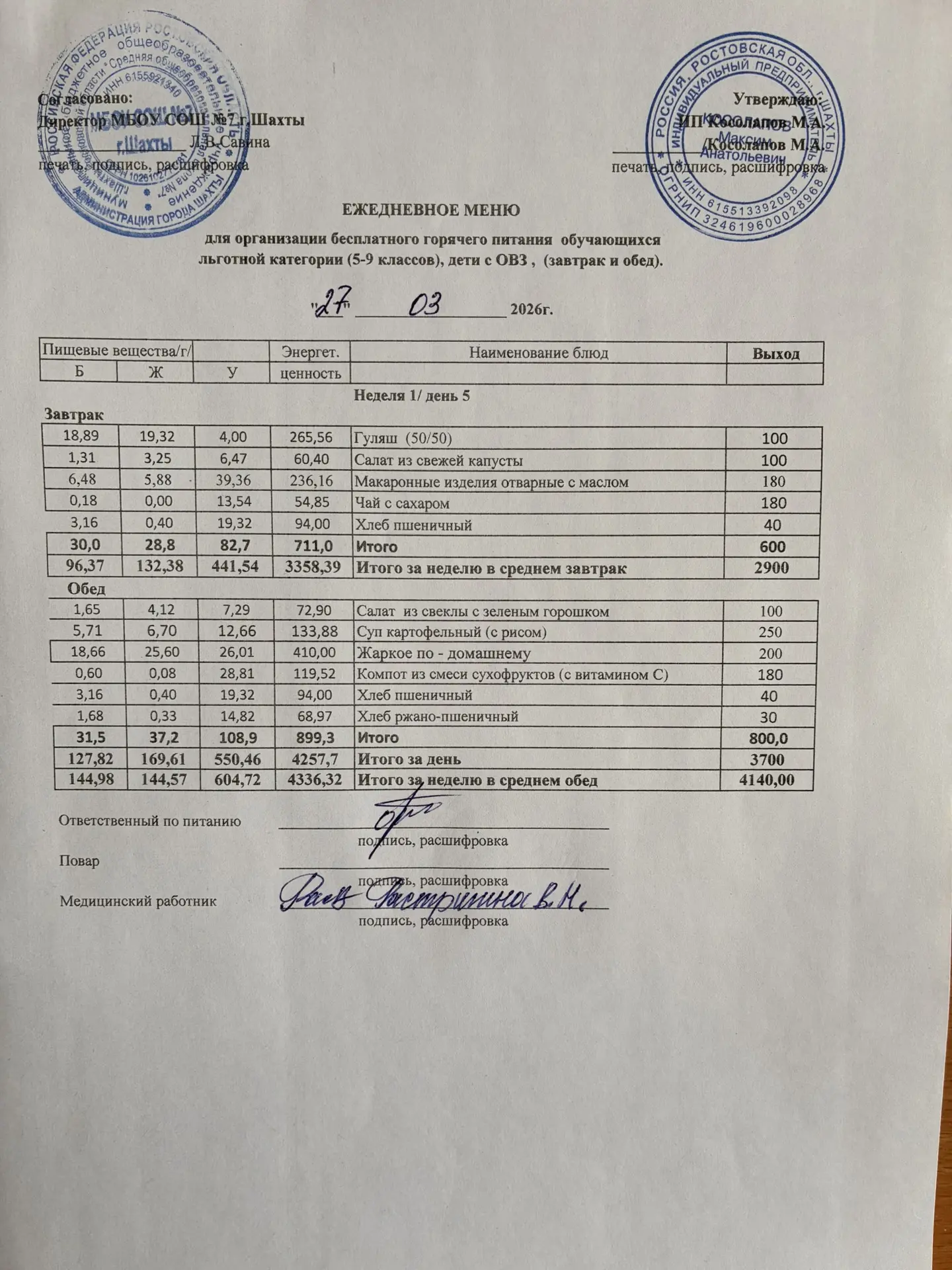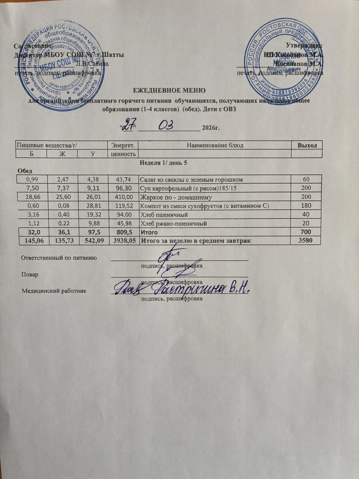 Меню 27.03. 2026 год для обучающихся льготных категорий 5-9 классов, дети с ОВЗ (завтраки и обед)